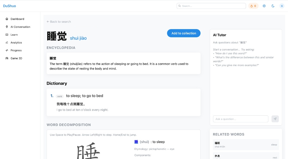I built DuShuo because I felt the content I was using to learn Chinese was not the content I actually enjoyed consuming. When I did find a show or article that I liked, I’d get frustrated by the amount of time it took to look up the meaning of a word I didn’t know. I often needed to look at multiple sources to truely understand the meaning and nuances of a word, which would cause me to break flow bouncing between tabs and applications (dictionary → notes → flashcards → back to content). The friction was small, but it happened often enough that I decided I needed a tool to help me learn Chinese.