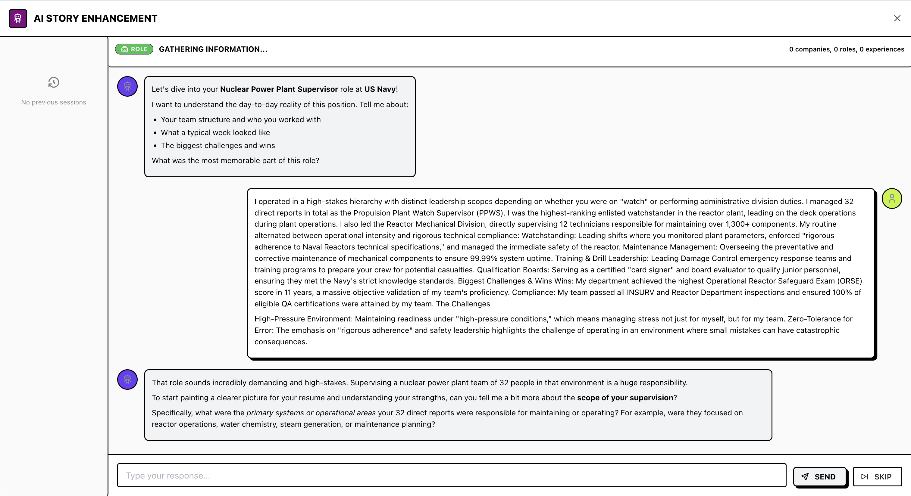 To fix this, I implemented a Context Extraction Workflow. Rather than relying on a one-page resume, the system uses a chat interface to “interview” the user. It prompts for specific details (team size, tech stack, outcomes) until it has enough information to populate a structured JSON schema.
