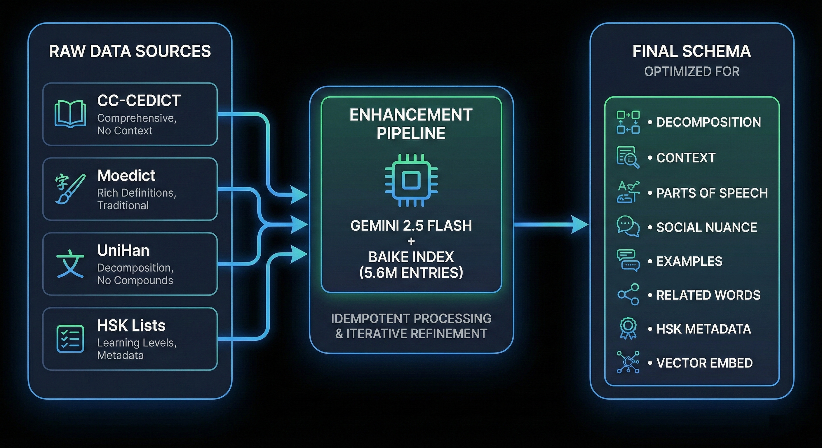 As I started to collect vocabulary terms, and organize them into collections, I realized that I needed a proper dictionary to tie into the extension. Sources like CC-CEDICT, Moedict, Baidu’s Baike, and Unihan provided a solid foundation, but they each lacked the pedagogical metadata needed for a true learning platform, often lacking a complete set of features that describe modern usage, nuance (“formal”, “internet slang”, “polite but stiff”), senses, parts of speech, patterns, and related terms.